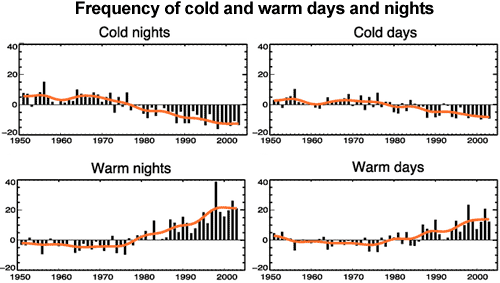• A final indication that global warming is primarily caused by increased greenhouse gases is the comparison between warming in daytime vs. night. If global warming is caused by solar activity, then days will warm more than nights. However, because the greenhouse effect acts around the clock, it should cause warming at night to be relatively greater than warming in the daytime. Fig. II.8 compares the coldest and warmest days and nights between 1951 and 2003 (these are defined as the 10% coldest or warmest periods), while the orange curves show the decadal trend. We see that the decrease in cold nights exceeds the decrease in cold days, while the increase in warm nights exceeds the increase in warm days. These are consistent with the greenhouse effect being the dominant driver of global warming.