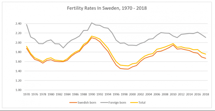 Sweden is an interesting example, as for nearly a century the Swedes have been aware of the possibility of population decline, and have instituted family-friendly policies ever since the publication of Crisis in the Population Question by Gunnar and Alva Myrdal in 1934. The Swedes provided “free health care for pregnant mothers and generous family allowance payments.” Such policies helped raise the Swedish birth rate from 1.7 in 1935, just following the Great Depression, to a high of 2.5 before birth rates fell after the rollout of the birth control pill.
