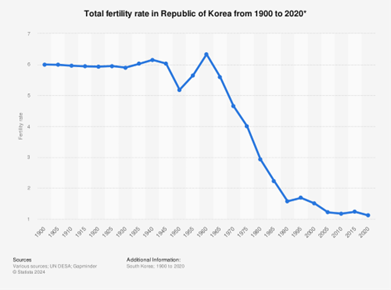 The South Korean experience represents a cautionary tale as their fertility rate is the lowest in all of the Organization for Economic Cooperation and Development (OECD) countries. In 1940 the Korean fertility rate was 6 births per woman, as shown in Fig. III.3, which follows the fertility rate from 1900 – 2020. But following the introduction of the birth control pill, South Korean fertility rates dropped extremely rapidly. During the rapid economic expansion following the Korean War, South Korea failed to provide retirees with generous pension plans. More recently the government also raised the mandatory retirement age; this meant that older citizens worked for longer periods, which removed entry-level jobs for younger workers. In addition, pregnant female workers tended to be laid off by their employers. All of these policies provided disincentives for women to marry and for families to have more children. The mean age at which South Korean women first get married is now up to 30.