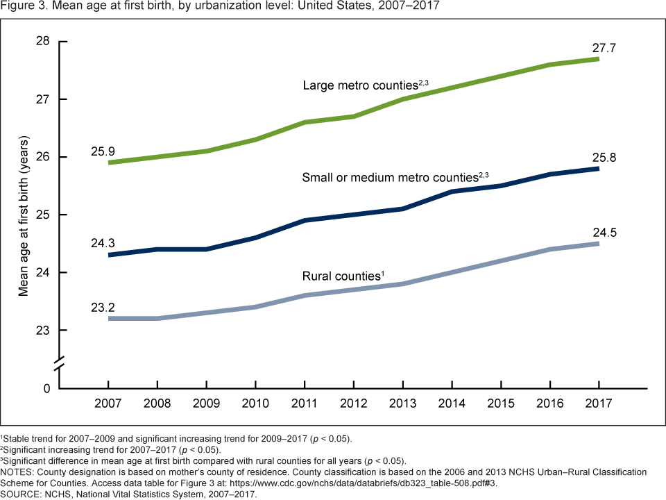 D.M. Ely and B.E. Hamilton, Trends in Fertility and Mother’s Age at First Birth in Rural and Metropolitan Counties: United States 2007—2017, National Center for Health Statistics, Oct. 2018, https://www.cdc.gov/nchs/products/databriefs/db323.htm