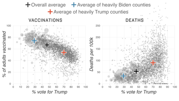 A result was that while at least 80% of Democratic voters were getting the COVID vaccine, roughly half of Republicans were vaccinated. Figure IV.2 shows results for every county in the U.S. from May to December of 2021, a time when the COVID vaccines were readily available. The left-hand graph shows the percentage of adults who were vaccinated against COVID vs. the percent vote that Donald Trump received in that county in the 2020 national election. The black cross is the national average of vaccine acceptance, while the red cross shows the average among heavily Trump counties and the blue cross shows the average vaccinations among heavily Biden counties. The right-hand graph shows the number of COVID deaths per 100,000 inhabitants in each county, again plotted against the percentage of Trump voters in that county, with similarly colored crosses.