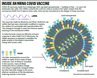 Figure III.3: Details of an mRNA COVID Vaccine. The messenger RNA is encased in a lipid nanoparticle that carries the mRNA into a cell. The mRNA contains the code that is used by cells to produce the spike proteins characteristic of the SARS CoV-2 virus. The mRNA has been modified to replace the uridine nucleotide with pseudouridine; this change apparently turns off the immune system reaction to the mRNA. One of the lipid particles in the fatty nanoparticle is ionizable; in the cell this makes the nanoparticle cling to negatively charged mRNA, but in the bloodstream the nanoparticles lose their charge.