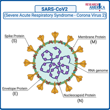 Figure II.3. The structure of the SARS-CoV-2 virus cell with surface spike proteins attached to the membrane surrounding the viral RNA.
