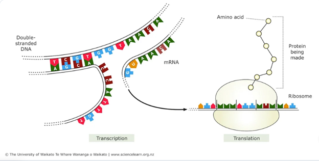 Figure II.2. Schematic illustration of the processes of transcription and translation by which mRNA copies genes inside the cell’s nucleus, then migrates to a ribosome in the cytoplasm to provide the gene’s detailed instructions for assembling amino acids into proteins.