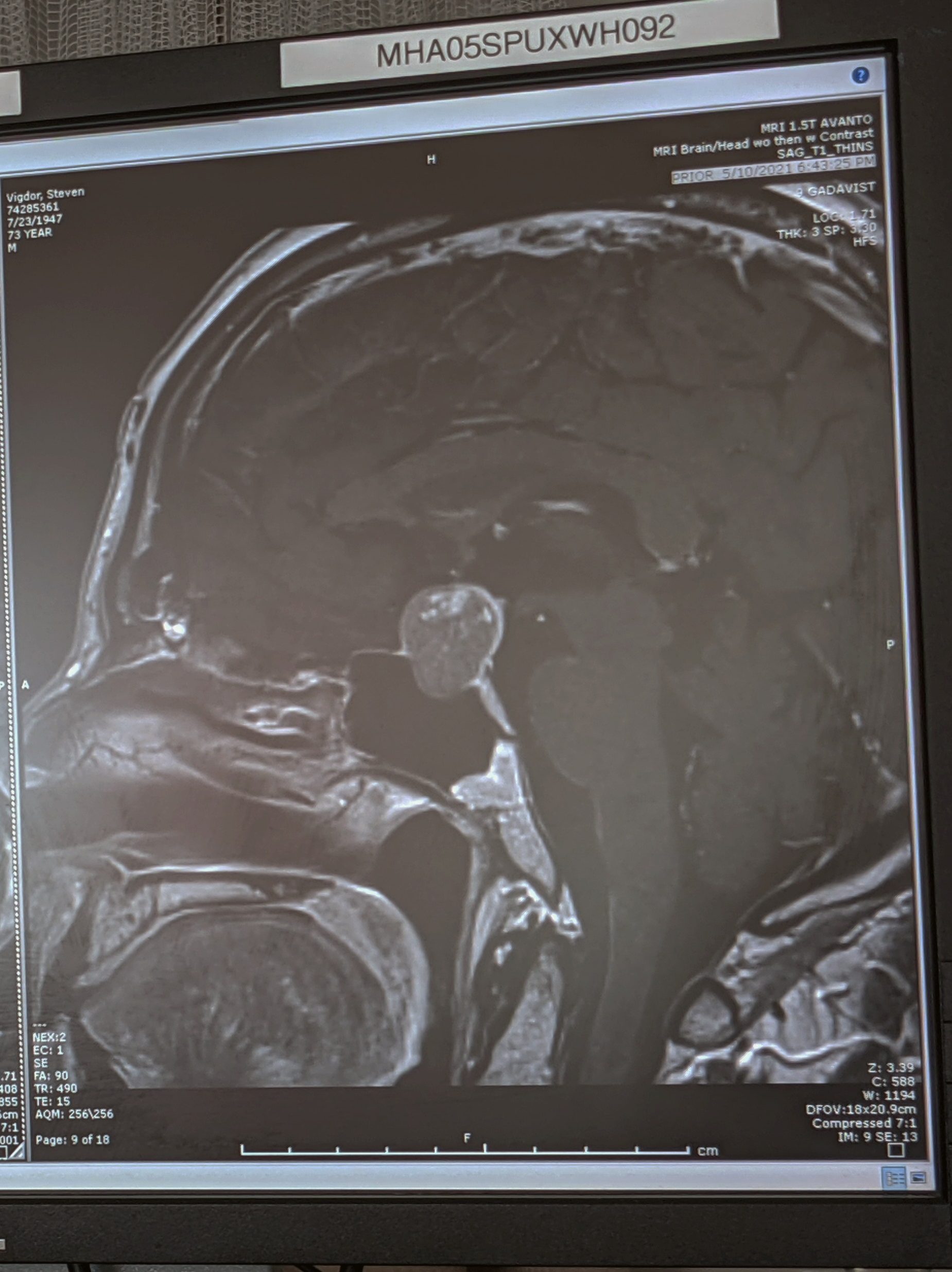 “If you have to have a brain tumor, yours is the one to have.” That’s what Dr. Jesse Savage told me shortly before he performed my neurosurgery. He showed me one of the MRI images of my tumor (see Fig. 8) and explained that it was exerting significant pressure on both the optic nerves and the pituitary gland. Much later, weeks after the surgery, I asked him what the normal diameter of the Sella is, and he told me it is “dime-sized.” My tumor was considerably larger than this and could fit in as it grew by not only squashing the pituitary, but also pushing out the walls of the Sella cavity.