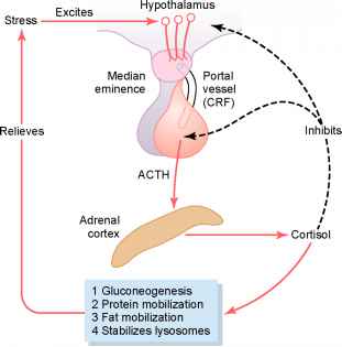 Cortisol is released directly by the adrenal glands just above the kidneys, but the pituitary gland plays a central role in stimulating and regulating cortisol production. As indicated in Fig. 10, a stressful stimulus excites the hypothalamus to secrete a peptide called corticotropin-releasing factor (CRF) into the anterior pituitary gland, which then, in turn, sends a signal to the adrenal glands via release of adrenocorticotropic hormone (ACTH). Upon receipt of the ACTH, the adrenal gland responds by increasing cortisol production to manage and hopefully relieve the stress. But the enhanced cortisol levels in the blood are sensed to provide negative feedback signals to the hypothalamus and the pituitary gland, to inhibit further ACTH and cortisol production once the stressful stimulus is successfully managed. This self-regulation is important to prevent the harmful effects of prolonged excess cortisol levels, which can include weight gain, high blood pressure, muscle weakness, and diabetes.