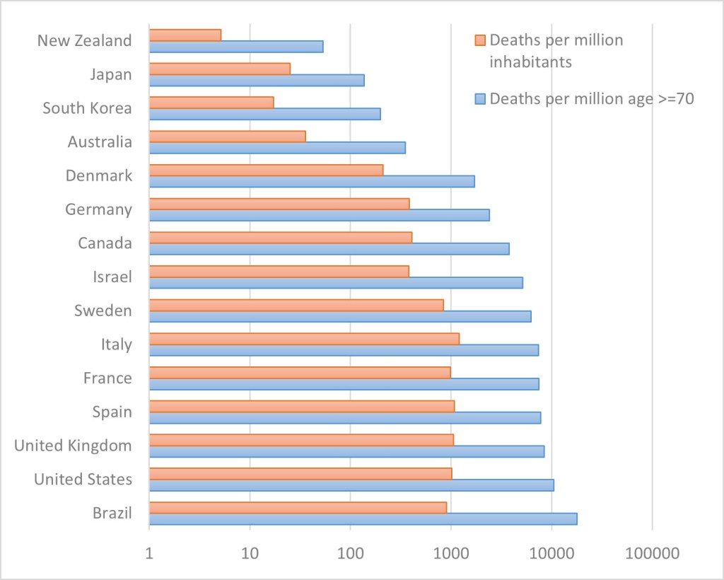 Figure 8: Death rates from COVID-19 per million people, for several countries. Note that the death rates are plotted on a logarithmic scale, where every scale marker represents a factor of 10 difference in the death rates. Orange bars: overall death rates; blue bars: deaths relative to the over-70 part of the population.
