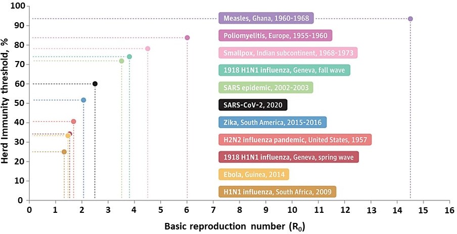 Nevertheless, the concept of “herd immunity” rapidly took hold in scientific circles; and this terminology became even more common once vaccines were developed. At this point, epidemiologists needed quantitative estimates to determine what fraction of the public needed to be vaccinated in order for the society to achieve herd immunity. Let’s consider the case where vaccination confers permanent immunity against a particular disease. We need to determine how infectious the disease is, which will depend among other things on the method of transmission of the disease, and the speed with which the virus spreads among individuals. Let us say that an infected person will, on average, transmit the disease to R0 other people. Then Eq. (1) gives the fraction F of the population that needs to achieve immunity in order to reach the ‘herd immunity’ level. The value of R0 varies greatly according to the disease. This is shown in Fig. 2, which plots the basic reproduction rate R0 vs. the herd immunity threshold (this is the quantity we called F in Eq. (1), expressed in percent).