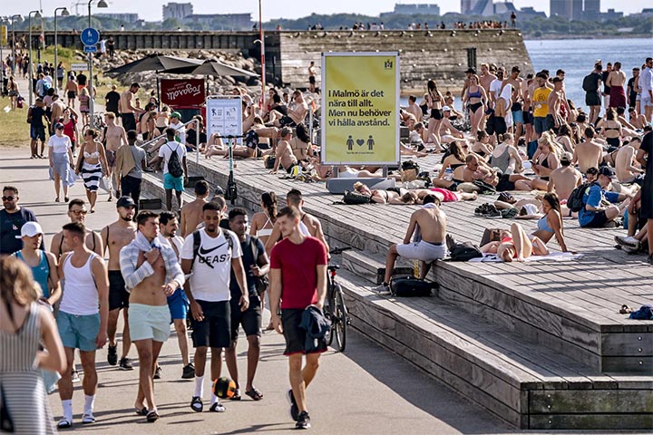 Figure 15: Swedish people at the beach in Malmo in summer 2020. Very few masks are in evidence and no social distancing seems to be observed.