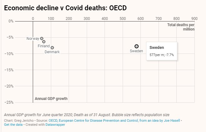 We showed that the laissez-faire policies recommended by libertarians would result in many more deaths, and more people suffering long-term health impacts. In particular we emphasized that the Swedish experience with COVID, which was similar in many respects to the response advocated by the right wing, has been a disaster. Relative to their Scandinavian counterparts, the Swedes have experienced nearly identical economic impact from the coronavirus, while the per-capita Swedish death rates have been as much as ten times greater than their neighbors.