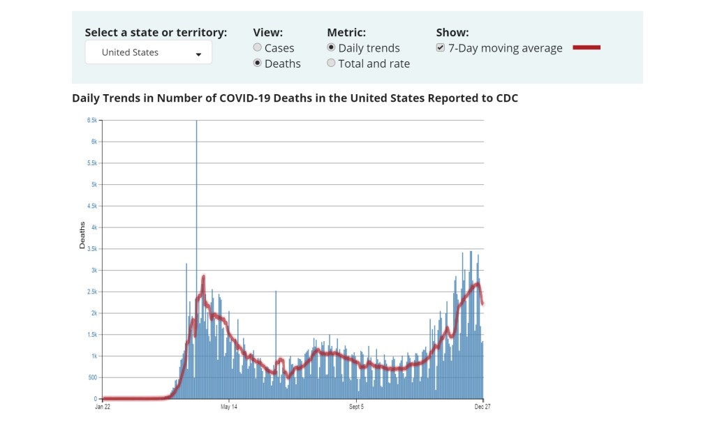 Figure 6: The number of daily deaths in the U.S. from the COVID pandemic vs. time. Near the end of December, nearly 3,000 people per day are dying from COVID; this is roughly the number that died in the 9/11 terrorist attacks on the World Trade Center.