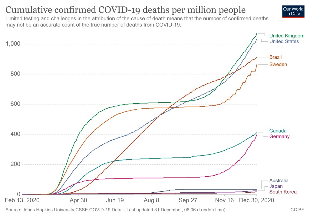 Figure 13: Cumulative deaths from COVID per million people for various countries, through Dec. 31, 2020.