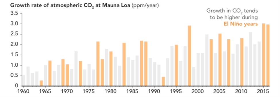 While El Niño is not itself caused by human burning of fossil fuels – its existence has been noted historically long before anthropogenic global warming was a concern — the global weather changes it brings tend to enhance impacts of human-caused global warming. For example, “major El Niño events—such as 1972-73, 1982-83, 1997-98, and 2015-16—have provoked some of the great floods, droughts, forest fires, and coral bleaching events of the past half-century.” Such enhancements are illustrated in the next two figures, which show that annual global temperature anomalies (Fig. III.6), while growing steadily from fossil-fuel burning, peak in El Niño years, as do increases in atmospheric carbon dioxide concentrations (Fig. III.7), as the warmer Pacific waters release more CO2 to the atmosphere.