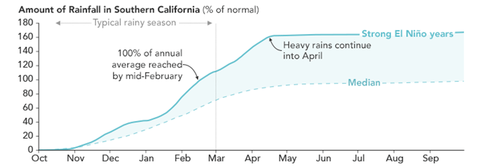 El Niño causes major disruptions to both weather patterns and fishing industries along the western coasts of the Americas. “Dry regions of Peru, Chile, Mexico, and the southwestern United States are often deluged with rain and snow, and barren deserts have been known to explode in flowers” (see Fig. III.3). During the current year’s El Niño Southern California, which has suffered through a number of previous years of extreme drought, has been lashed by heavy winds and rainfall produced by an “atmospheric river” coming from the Pacific. As shown in Fig. III.4, Southern California receives almost twice its normal amount of rain during El Niño years. In contrast, the Pacific Northwest tends to be warm and dry during El Niño years. Meanwhile, the submersion of normally upwelled cold water, and the nutrients it carries, reduces the amount of phytoplankton near the western coasts of South and North America, upsetting the ocean food chain and negatively impacting fishing off these coasts.