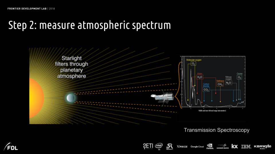 As indicated by labels in Fig. III.7, a set of sharp dips in the visible portion of the spectrum reveal the presence of oxygen and ozone, which, as we noted earlier, are produced by photosynthesizing organisms on the surface. The dips labeled as arising from water vapor indicate the presence of surface oceans. Dips caused by CO2 in the near infrared, as well as ones not shown in the deeper infrared, suggest both volcanic activity and the burning of fossil fuels. A dip at the right edge of the figure and ones deeper in the infrared indicate the presence of methane, some emitted from volcanoes, some from the production of oil and gas, and a lot by anaerobic bacteria and the digestive system of cattle, who emit methane in burps and excretions. The reflected light spectrum thus serves as a “fingerprint” indicating not only conditions favorable to life, but also the existence of life itself, on the planet. As we discuss further in section V, the coexistence of oxygen and methane in a planet’s atmosphere is considered to be a particularly promising signature of life.