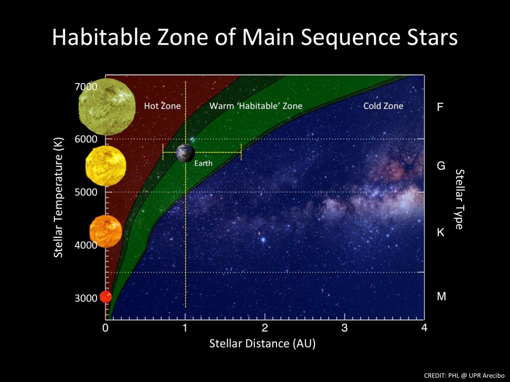 The most basic requirement for a planet to host liquid water on its surface is that it fall within a “Goldilocks” or Habitable Zone of distances from the star the planet orbits, where its surface temperature is neither too cold nor too hot, but just right for water to maintain the liquid state. As illustrated by the green band in Fig. II.2, the range of suitable distances depends strongly on the surface temperature of the star. The distances in Fig. II.2 are measured in astronomical units (AU), where the mean distance of Earth from the Sun is defined to be 1 AU.