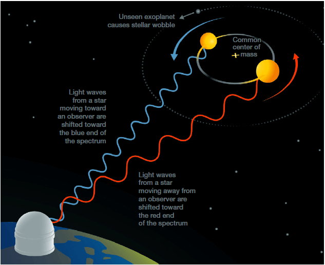 Subsequent early discoveries were made by detecting the periodic motion of stars toward or away from Earth caused by orbiting exoplanets. In everyday language, we say that Earth revolves around the Sun. But more precisely, the Earth and the Sun exert equal and opposite gravitational forces on each other and, in the absence of other planets, both would revolve with the same period about their common center of mass. Since the Sun is so much more massive than the Earth, that center of mass is quite close to the center of the Sun, so the Sun’s motion is over much smaller distances than Earth’s and at an orbital velocity opposite in direction to and smaller than that of Earth by the ratio of the Earth mass to the Sun mass. (Of course, the Sun is responding to gravitational pulls from all the planets in the solar system.) If a distant star has a comparable planet-induced wobble that leads to periodic changes in the star’s radial velocity toward or away from Earth, then that velocity change results in a tiny Doppler shift up and down in the wavelength of light received on Earth from the star (see Fig. III.1). That Doppler shift is the analog of the change in sound wave frequency you hear from the engine hum of a race car approaching you versus receding from you.