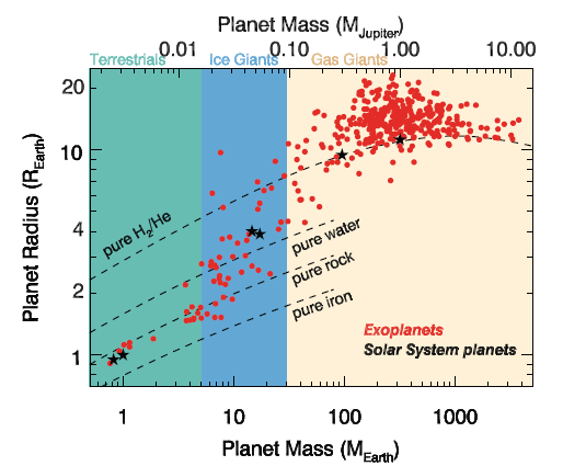 At the time of the 2018 National Academies Exoplanet Science Strategy, there were a total of 418 transiting exoplanets whose masses, as well as radii, had been measured with better than 20% precision, allowing a determination of their mean densities. Their masses and radii are shown in Fig. IV.4 along with expected correlations for simple planetary compositions. Those that lie like Earth along the “pure rock” curve are candidates to be probed for habitability.