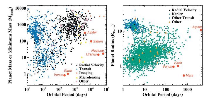 The more detailed distribution of the discovered exoplanets with respect to orbital period, mass and radius is shown in Fig. IV.2. The color coding in the figure indicates which of the techniques described above in section III was used to make the discovery of each planet. It is clear that a majority have been discovered by the transit method, and particularly by the Kepler telescope. However, most of the planets seen in transit in front of their stars have not yet been analyzed by other methods, and do not yet have measured masses, so they appear only in the right-hand plot in Fig. IV.2. By the same token, most of the planets discovered by the radial velocity technique appear only in the left-hand plot because they have not been seen in transit, so they do not yet have measured radii.