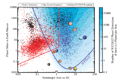 The NGRST, aiming for launch by 2027, will carry two instruments with sensitivity in the visible and near infrared portions of the electromagnetic spectrum. The wide field instrument should provide resolution similar to that achieved with the Hubble Space Telescope, but with 100 times larger field of view. In addition to providing deep space probes of cosmic structures, it will revolutionize the use of gravitational microlensing for identification and mass determination of exoplanets. As seen in Fig. V.2, this microlensing survey will go far beyond the orbital period limits of previous transiting surveys, so that it should be able to reveal other planetary systems with greater similarity to the large orbits around Sun-like stars of our solar system.