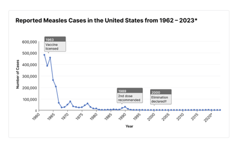 Robert F. Kennedy Jr. (Fig. 6) is a former environmental lawyer. As the founder and head of the Children’s Health Defense group, he has now spent decades promulgating claims that vaccines are unsafe and ineffective. In fact, vaccines are one of the safest and most effective medical treatments ever devised. Vaccines have been responsible for eradicating the deadly disease smallpox across the globe, and they have very nearly wiped out polio. Cases of measles in the U.S. declined dramatically after the measles vaccine was approved in 1963. A second dose of the vaccine was recommended after a brief spike in cases in 1989, and by 2000 it was declared that measles had been eliminated as an endemic disease in this country. Figure 7 shows measles cases in the U.S. as a function of time; clearly, the measles vaccine essentially eliminated endemic measles by the year 2000. However, a campaign led by Kennedy’s Children’s Health Defense group is leading to large numbers of people opting not to vaccinate for childhood diseases. This suggests that diseases such as measles, chickenpox, whooping cough, diphtheria and others are likely to make a comeback, particularly if RFK is confirmed as Secretary for Health and Human Services.