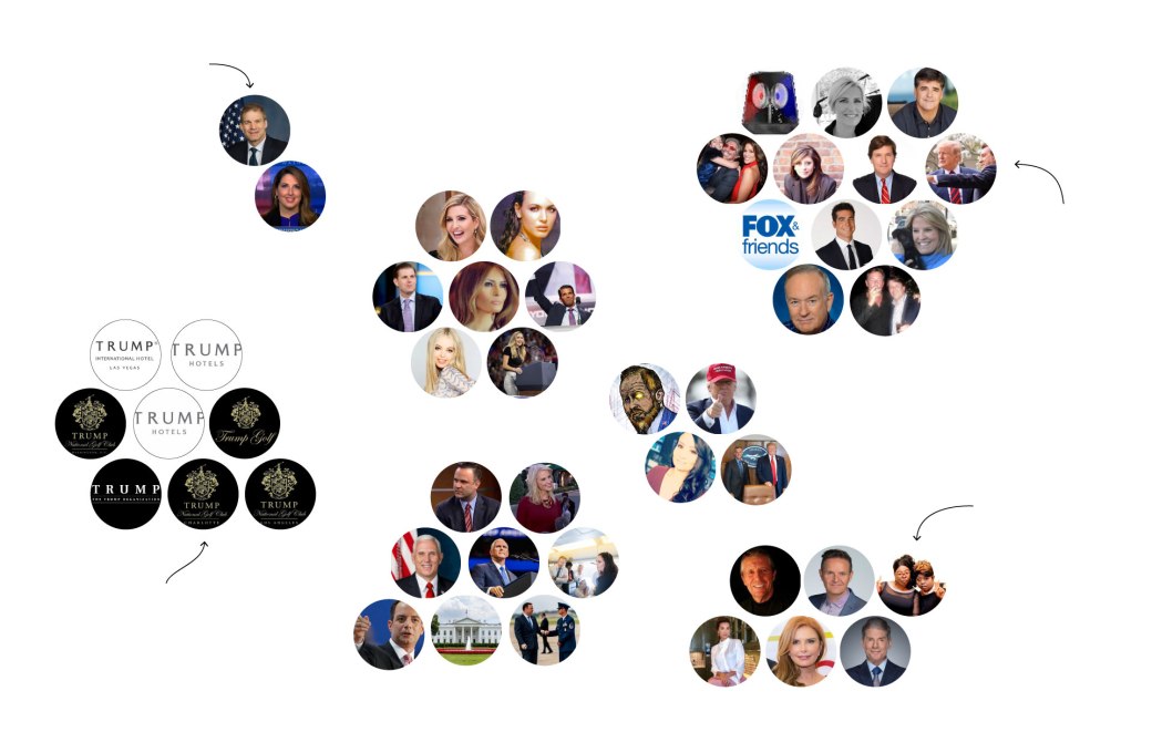 Figure 12 below shows the 47 people and groups that Donald Trump followed on social media as of November 2019. They consisted of one Congressman (Rep. Jim Jordan), several members of his own family, several commentators for Fox News, a number of Trump.org sites, several current and former members of his administration, various current and former members of his campaign staff, and a few conservative social-media personalities.