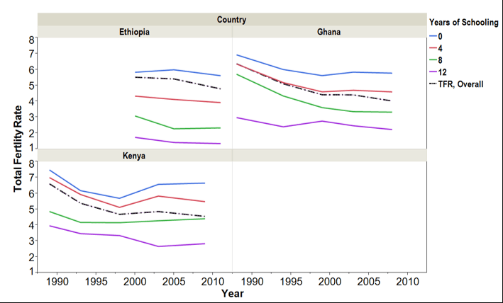 The single greatest determining factor in women’s adoption of contraceptives is the level of their education. Thus, the worldwide correlation of average years of female schooling and average national fertility rate in Fig. III.4 looks very similar to the correlation with contraceptive prevalence in Fig. III.1. The strong dependence on the level of female education appears worldwide, independent of the prevailing culture or form of government in a country. This is illustrated in Figs. III.5, III.6, and III.7 by data for China, for the U.S., and for several African countries, respectively. In particular, the modest fertility rates in Ethiopia, Kenya and Ghana among women who have at least twelve years of schooling suggest that overall African fertility will decline rapidly through the rest of this century as a larger fraction of African women make it through high school. Worldwide groups such as the Taliban in Afghanistan who are trying to limit female schooling are doing so to maintain a patriarchal society and to keep birth rates high.