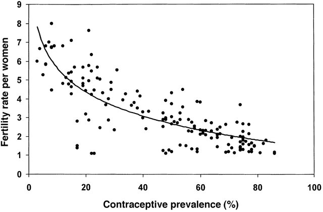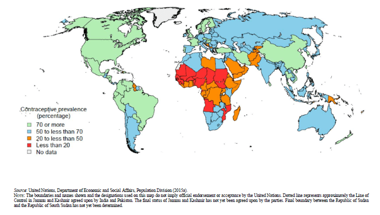 In order to probe in more detail the causes of the accelerating worldwide Baby Bust, we can examine data on correlations of fertility rates with other variables. The dominant factor is revealed in Fig. III.1, which shows U.N. Population Division data for the year 2000 manifesting the correlation among the world’s countries between fertility rate and contraceptive usage. A world map of contraceptive prevalence is shown for 2015 in Fig. III.2. The countries with less than 50% adoption of contraceptive practices in that map align extremely closely with the countries with high fertility rates in Fig. II.4.