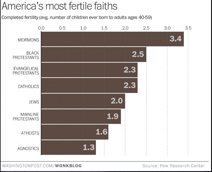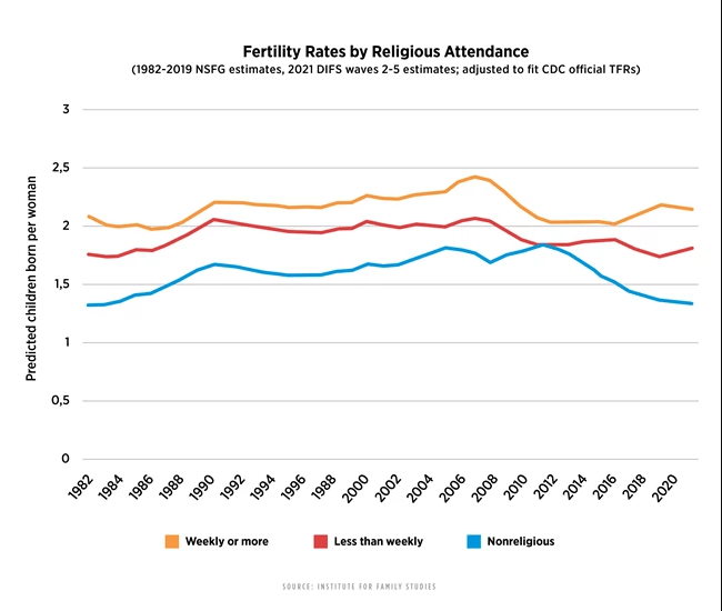 Religious affiliation also has significant influence on fertility. Results from a 2015 Pew Research survey in Fig. III.13 show that among U.S. religious (or irreligious) groups, fertility rates vary from a high of 3.4 for Mormons to a low of 1.3 for agnostics. The leaders of organized religions, charged with overseeing the maintenance and propagation of the faith, have traditionally encouraged procreation and discouraged contraception. This is especially true of the Catholic Church, but as its influence has waned in the 21st century in countries and regions such as Spain, Ireland, the Philippines, and Quebec, fertility rates among Catholics in those locations have dropped markedly. There is also a correlation of fertility with the level of religious attendance, as evidenced in U.S. data in Fig. III.14: the more frequently women attend religious services, the higher their birth rates, on average.