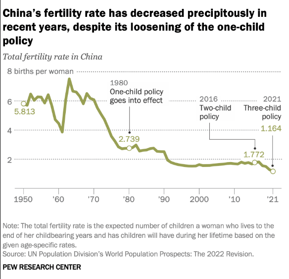 The fertility rate recovered slowly to 1.77 by 2016, but the government was by then concerned about population loss, so it relaxed the policy to allow two children per family “to improve the balanced development of population,” i.e., in the hope of matching males to females in the subsequent generation. Despite that government program, the fertility rate then dropped precipitously to 1.16 by 2021, and that does not even yet include the major effect the COVID-19 pandemic has had on Chinese births and population. In response, the government has further relaxed the family size limits to allow three children. But by now, Chinese women have largely adopted the socially acceptable view that giving birth to one child is enough; former family pressures to produce larger families have largely disappeared. In a recent Ipsos survey of worldwide attitudes about “ideal” family size, an astonishing 91% of Chinese respondents said the ideal family should have no more than two children. In 2022 Chinese deaths exceeded Chinese births for the first time in six decades and a steady decline in China’s population going forward may well be unavoidable. The global trends seen in Fig. II.3 have been exacerbated by Chinese government policies.
