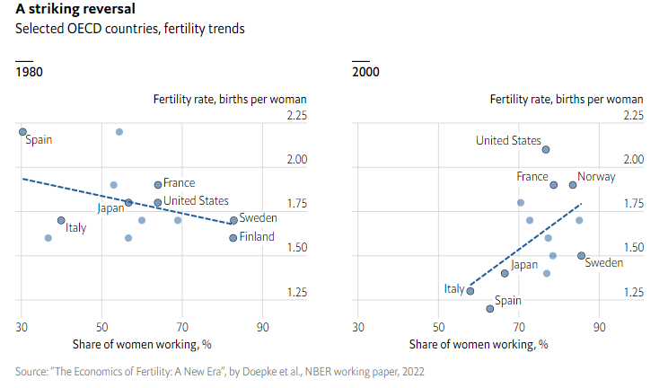 The influence of women entering the workforce on fertility is complex and time-dependent. Working women tend to delay pregnancies in order to establish a career; on the other hand, they enhance household income and make it more economically feasible to raise children. A 2022 study of trends in various developed countries by the National Bureau of Economic Research (NBER) showed (see Fig. III.16) that in 1980 countries with a larger percentage of women in the workforce tended to have lower fertility rates. A likely explanation is that working women found it difficult and often incompatible with their careers to have children, at least during their earlier child-bearing years. But by 2000 the trend appeared to reverse. On the other hand, if one examines the figure in detail, one sees that as females in the workforce increased some countries (e.g., Spain, Italy, Japan, and Sweden) saw a significant decrease in fertility rates between 1980 and 2000, while others (Norway and the U.S.) saw significant increases (that was prior to the sharp fertility decrease in the U.S. after the 2008 Great Recession).
