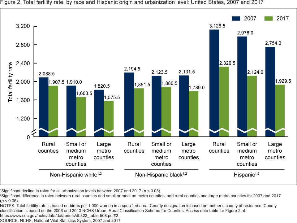 The initial decline in birth rates during the 19th and early 20th centuries among a number of Western countries could be attributed, as we described in Section II, in large part to the increasing urbanization in industrialized economies. But what role does urban living play in today’s accelerating Baby Bust? As revealed in Fig. III.9 by U.S. fertility data in rural and urban counties within two size categories, urbanization continues in the 21st century to have influence on fertility rates, although much smaller effects than contraceptive usage and educational level.