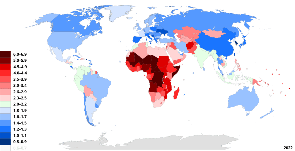 Current worldwide fertility rates are indicated via color-coding in the map of Fig. II.4. High fertility rates remain in much of Africa and several countries in the Middle East. But most of the developed world is now in Stage 5, with fertility rates below replacement level. Especially low fertility rates are found in China, Japan, South Korea, Singapore, Spain, Italy, Germany, Albania, and Ukraine (clearly influenced in the latter case by the ongoing war with Russia).