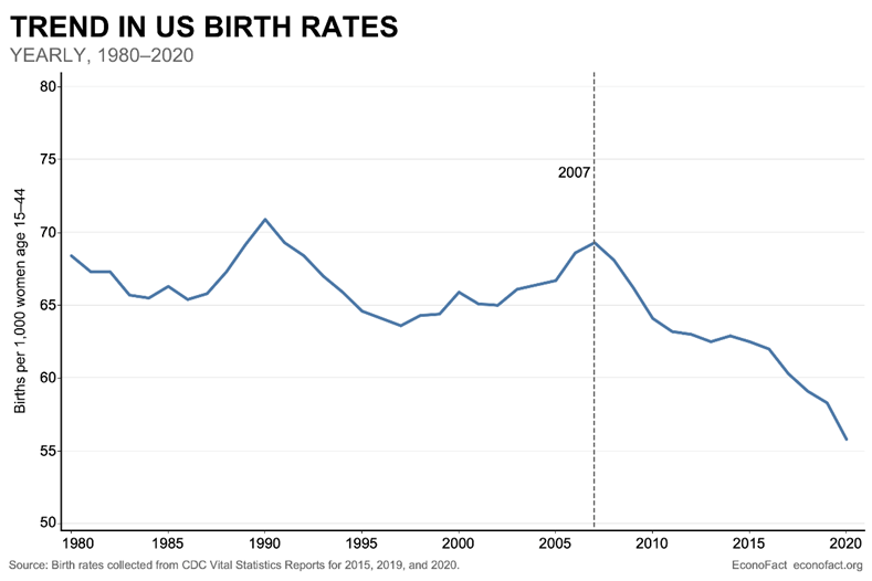 The Great Recession that began during 2008 and caused widespread unemployment through 2010 led to a substantial drop in birth rates around the world, including in the U.S. But while the U.S. birth rate stabilized for several years at a relatively low rate, it has dropped rapidly since about 2016, again without even yet factoring in the impact of the COVID-19 pandemic of 2020-21. The causes of this recent decrease are not yet well understood, but they seem to reflect personal choices more than economic conditions or government policies. We will explore some of the attitudes behind those personal choices in Section III.