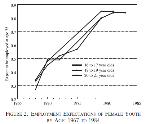 With the advent of the birth control pill around 1960, along with advancements in the education of girls, women became capable of satisfying evolutionary pressures for sexual desire without risking pregnancy. Women gained control of their reproductive choices, became better educated, entered the workforce in greater numbers, and often made personal choices to have fewer babies. These transformations constituted a “quiet revolution” in the words of Claudia Goldin, the Harvard economist who was just awarded the 2023 Nobel Prize in Economics for her seminal work providing the data and the analyses of women’s impact on labor markets. Two aspects of that mid-20th century revolution in female experience and expectations in the workforce are shown in Fig. I.2, taken from Goldin’s work. Labor force participation rates for married white American females of age 35-44 rose from about 15% in 1940 to about 75% by 1990. And the attitudes of young women changed even more rapidly: in 1968 about 30% of white American females aged 16-21 expected to be employed at age 35, but that percentage rose to 85% by 1980.