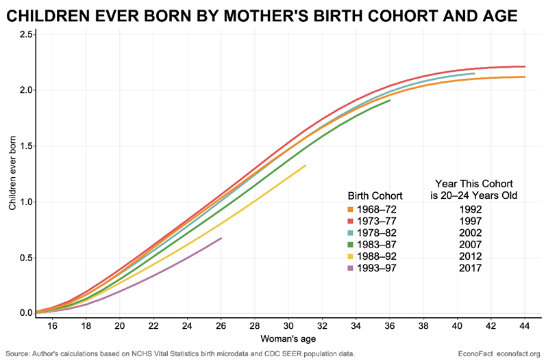 As seen in Fig. II.9, a significant part of the U.S. trend results from women delaying childbirth, on average, as they seek higher education, a stable entry into the workforce, and family economic stability before taking on the increasing costs of child rearing. U.S. Census reports have documented an increase in the median age at which women give birth from about 27 in 1990 to 30 in 2019. And that delay affects all ethnic groups of women in the U.S. similarly. A delayed start in raising a family runs up against women’s biological clocks and leads to a reduced overall birth rate. As in China, the social acceptability of women having only one or zero children has advanced rapidly over a generation. This effect is illustrated in Fig. II.10, where women born in the mid-1980s and later have shown a steadily decreasing tendency to bear children by any given age of the woman than was typical of earlier generations.