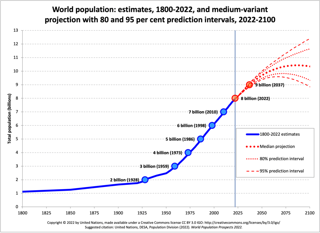 The timing of the projected global population peak depends on how various groups predict human fertility rates to evolve into the future. The United Nations Population Division, whose median projection is the one shown in Fig. I.3, makes generally conservative projections and predicts a population peak in the 2080s. However, as pointed out by Dean Spears in an opinion piece in the Sept. 18, 2023 New York Times, the Wittgenstein Center for Demography and Global Human Capital in Vienna projects a peak in the 2070s. The Institute for Health Metrics and Evaluation at the University of Washington puts the peak in the 2060s. In all likelihood, global population will begin to decline during the life span of today’s children. And it has already begun to decline in some countries. China saw the number of deaths exceeding the number of births in 2022, for the first time in six decades. Japan’s population peaked in 2010 and is currently declining slowly.