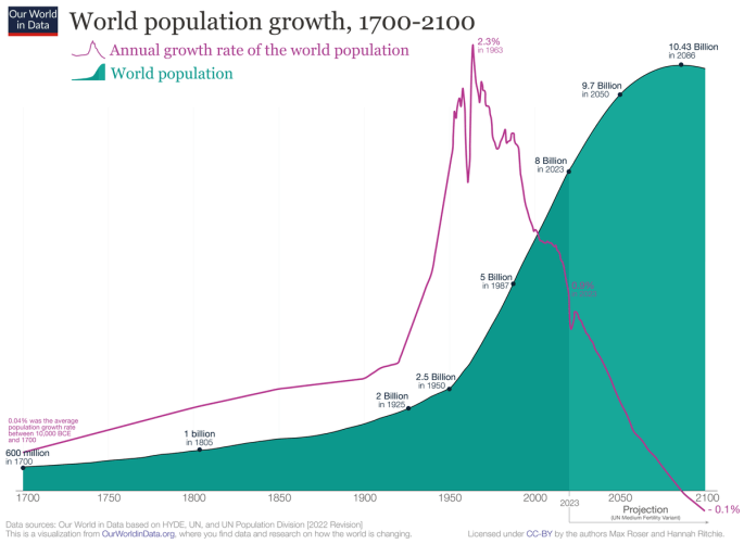 But we are focused here on the impacts of the above developments on human fertility. The impact on the rate of growth of human populations is clearly evident in the purple curve in the population graph of Fig. I.3. Global population exploded during the 20th century despite that century featuring: two World Wars that caused some 70 million worldwide military and civilian deaths; the 1918 influenza epidemic that resulted in some 40-50 million worldwide deaths; Stalinist purges that caused tens of millions of deaths in the Soviet Union; and the Great Chinese Famine of the late 1950s, resulting from Mao Zedong’s Great Leap Forward, that resulted in more than 45 million human deaths. The global population is still growing in 2023, but at less than half the rate it was in the 1960s. Population continued to grow rapidly through the beginning of this century because even though the post-World War II Baby Boomers had fewer children on average than their parents, there were a lot more of them around. Furthermore, birth rates remain high in countries where economic development is just getting started. However, an extrapolation of current trends is justified by exploring its causes (as we do in Section III of this post), and it leads to a projection of likely global population decline before the end of the 21st century. While the 20th century will always be viewed as one of population explosion, the 21st century will probably be recorded as the period when human population peaked.