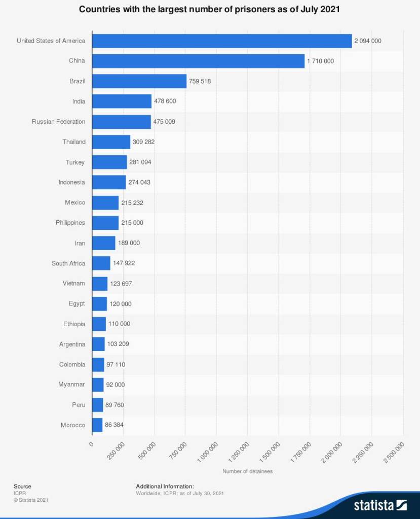 Figure 7: The number of citizens in prison for various countries, as of July 2021. Note that the U.S. has more prisoners than China, despite the fact that China has over 4 times as many citizens as the U.S.