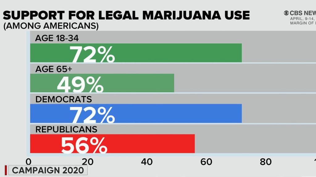 Figure 20: Support for legal marijuana use among Americans in 2020, divided among age groups and Democrats vs. Republicans.