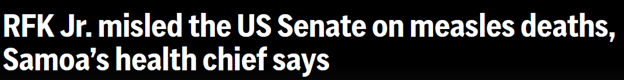 Charlotte Graham-McClay, RFK Jr. Misled the US Senate on Measles Deaths, Samoa’s Health Chief Says, AP News Feb. 3, 2025 https://apnews.com/article/rfk-jr-samoa-measles-kennedy-vaccines-pacific-42a9cb583c71f165699b16710884c474