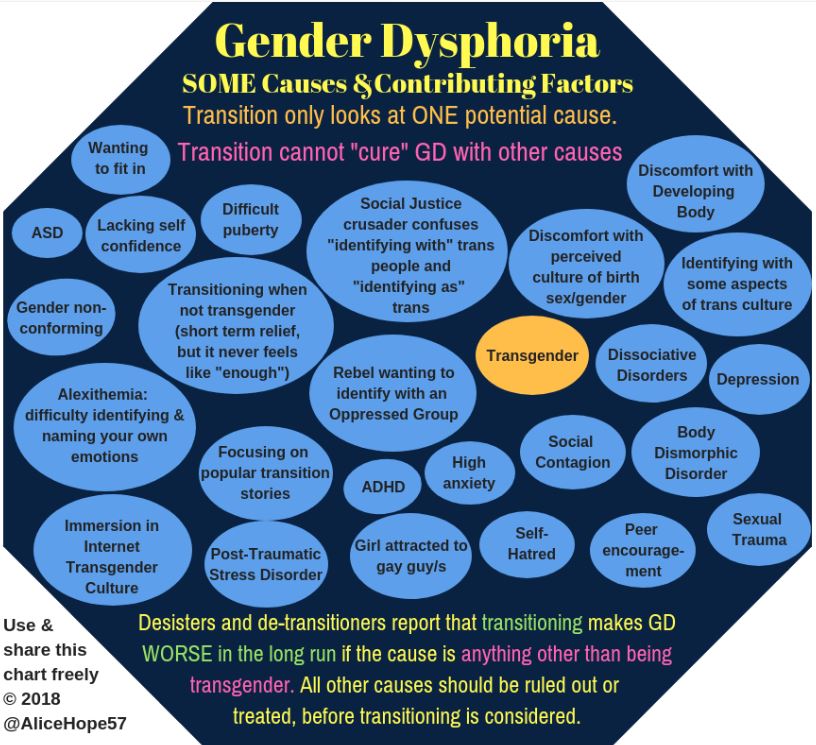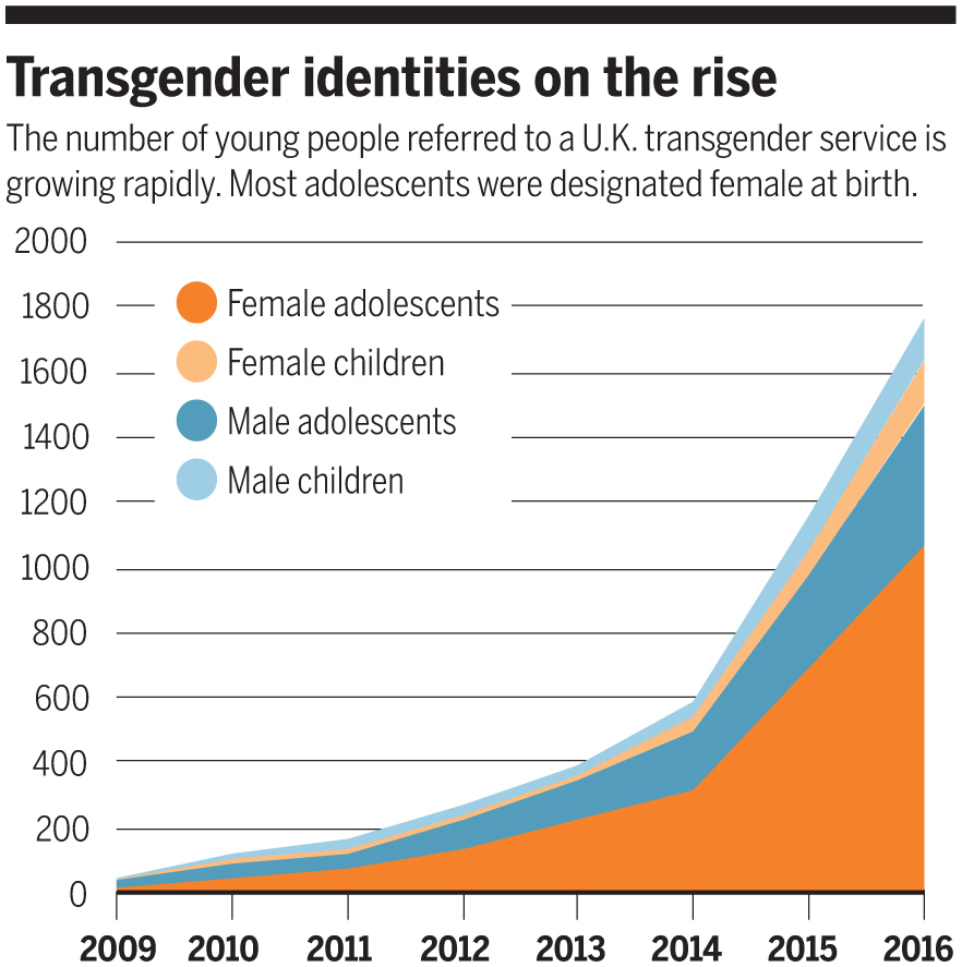 A 2018 study of 256 ROGD girls by Lisa Littman of Brown University has drawn the furious ire of trans activists who accused Littman of transphobia and convinced the journal PLOS One to conduct a highly unusual post-publication review of the paper (they subsequently published a revised version). Littman’s online survey of the girls’ parents revealed that many of the girls had come out as gay or bisexual, or had mental health disorders such as autism or borderline personality disorder. Nearly 40% of the surveyed girls had several friends who had recently also self-identified as transgender. Littman concluded that none of the 256 girls met the DSM-5 diagnostic criteria for gender dysphoria in childhood. The phenomenon then appears to be a form of social contagion. Some of the ROGD girls appear to have been sexually abused or threatened, and think they would feel safer and more widely accepted as males.