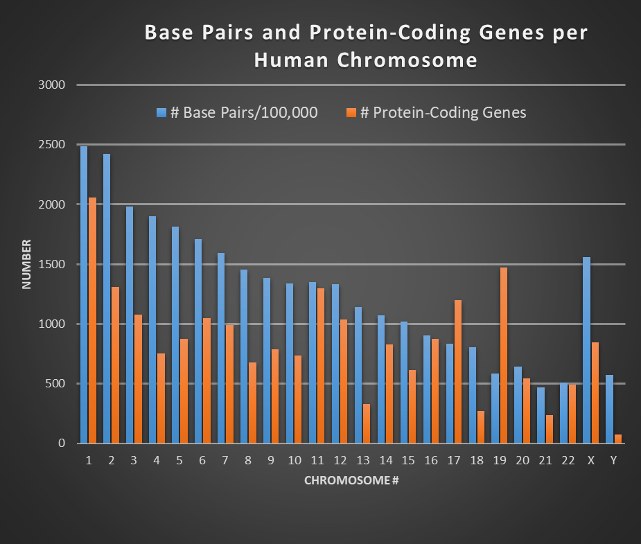 The human genome consists of 23 pairs of chromosomes. The number of base pairs and of protein-coding genes on each of these is shown in Fig. II.1. An individual’s biological sex is determined by the X and Y chromosomes: females have two X chromosomes, while males have a single X and a single Y. When chromosomes from the two parents are combined in a fertilized egg, the mother can only contribute an X, while the father contributes either an X for a daughter or a Y for a son.