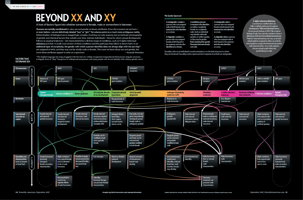 The chart in Fig. III.1 summarizes the types of intersex condition, their effects at birth and at puberty, and possible treatments. The chart is too dense to read easily at the size we can reproduce it, so interested readers are referred for more details to the 2017 Scientific American article in which the chart appeared.