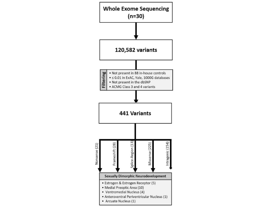 Another recent study at Yale University sequenced all the protein-coding genes in the DNA of 13 transgender males and 17 transgender females, and compared them to a control group of 88 non-transgender individuals. Among many genetic variants identified (see Fig. V.1), “21 variants in 19 genes were found to have associations with previously described estrogen receptor activated pathways of sexually dimorphic brain development…Our findings suggest a new avenue for investigation of genes involved in estrogen signaling pathways related to sexually dimorphic brain development and their relationship to gender dysphoria.” While this type of research is just beginning, it already suggests a strong association of gender dysphoria with genetic variants that hinder sex hormone (both testosterone and estrogen) secretion during fetal and infant brain development.
