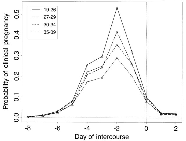 D.B. Dunson, B. Colombo, and D.D. Baird, Changes with Age in the Level and Duration of Fertility in the Menstrual Cycle, Human Reproduction 17, 1399 (2002), https://www.researchgate.net/publication/11388268_Changes_with_age_in_the_level_and_duration_of_fertility_in_the_menstrual_cycle