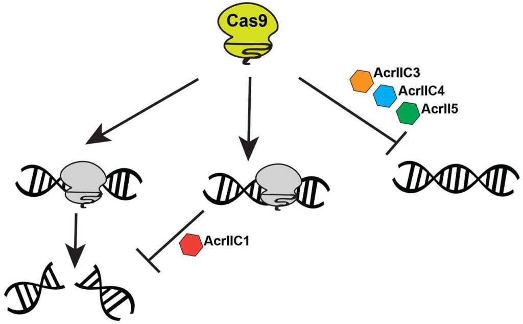 Nature and evolution had already provided a solution. Just as CRISPR itself was discovered initially in the immune system many bacterial species had evolved over eons to destroy invading viruses that had been encountered in preceding generations, the CRISPR kill switch, or anti-CRISPR was discovered accidentally, in the form of proteins produced by some genes in viruses whose genome had evolved to overcome the bacterial immunity. These were initially discovered by a group at the University of California at San Francisco. By now more than 50 anti-CRISPR proteins have been characterized, each with its means of blocking the cut-and-paste action of CRISPR systems: some inhibit the splicing action of the Cas9 enzyme, while others inhibit the ability of the CRISPR complex to lock onto its targeted DNA segment – see Fig 7.