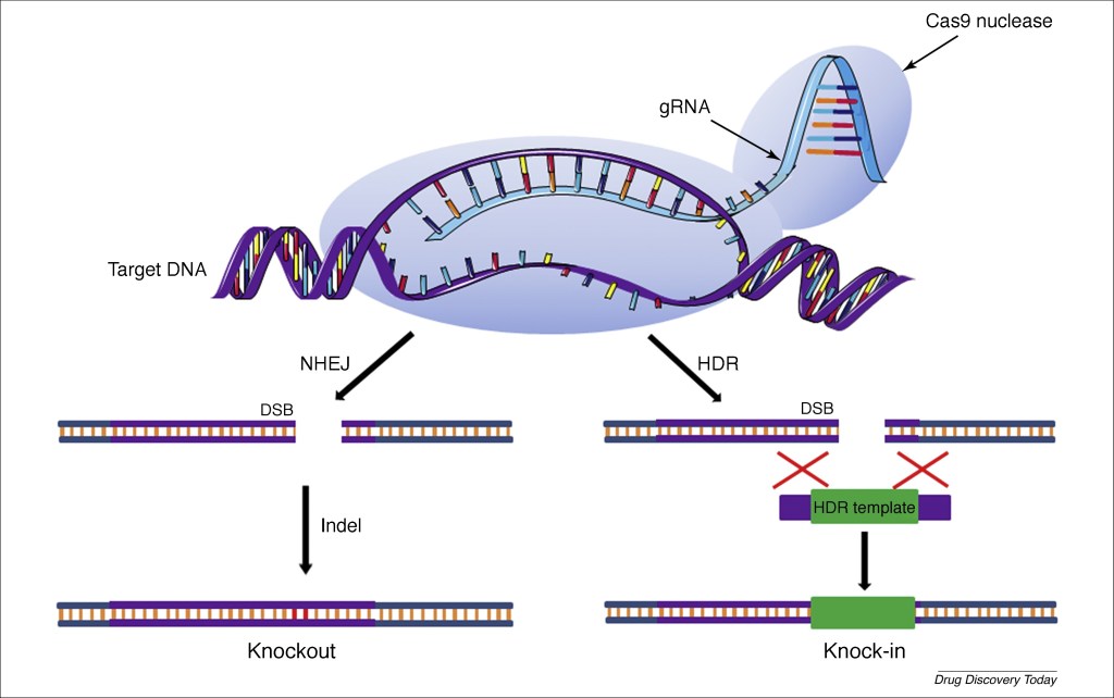 Figure 3 shows the entire CRISPR complex and how it operates. The crRNA section of the guide RNA (gRNA) attaches to one complementary strand of the targeted section of DNA, and the Cas9 enzyme then cleaves both strands (forming a double strand break, DSB) adjacent to DNA marker sequences known as PAMs (protospacer adjacent modif). After the cleavage, the break is repaired by one of two natural DNA repair mechanisms: either “non-homology end joining” (NHEJ) for gene knockout, or homology-directed repair (HDR) to copy a nearby available template section for precise gene replacement (or knock-in).