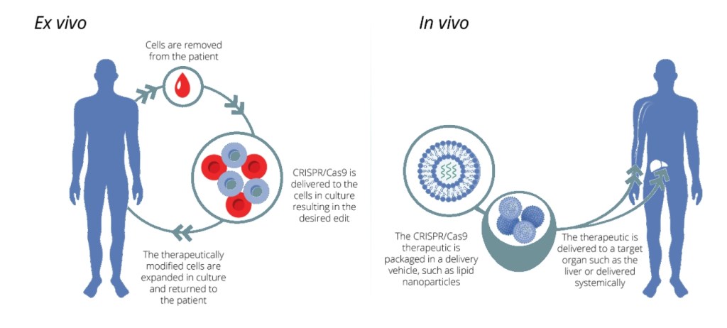 The treatment of sickle-cell anemia is best done ex-vivo (see Fig. 5) by extracting blood stem cells, editing them outside the body, and then reinjecting the modified cells where they can produce healthy hemoglobin. Other somatic edits can be done in-vivo (Fig. 5) if the targeted cells are not easily removed from the body and there is an appropriate delivery mechanism to get the CRISPR complex to the nucleus of the particular cells of interest inside the body.