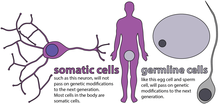 One can distinguish three types of CRISPR editing, differing in the inheritability of the engineered changes to DNA. Figure 4 indicates the distinction between two of these types, somatic cell and germline cell editing. The vast majority of human cells are somatic cells uninvolved in reproduction. Hence, edits made to DNA within somatic cells are not passed along to the next generation, though they can be critical for treating diseases centered in those cells and related to gene mutations. A prominent example is sickle-cell anemia, which involves a shape distortion of red blood cells caused by a kink in hemoglobin protein arising from a single-base mutation that occurs in both copies of a single gene in the two chromosomes contributed by a person’s biological father and mother.